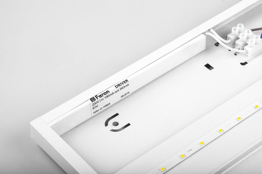 Светильник встраиваемый светодиодный, АРМСТРОНГ (ДВО) FERON, 36W 6500К (дневной), 185-265V, 3100Lm, IP40, угол рассеивания 120°, цвет белый, корпус штампованная сталь, рассеиватель акриловый полимер с призматической структурой, 595*595*15 мм, монтажн.отв. 595*595 мм.