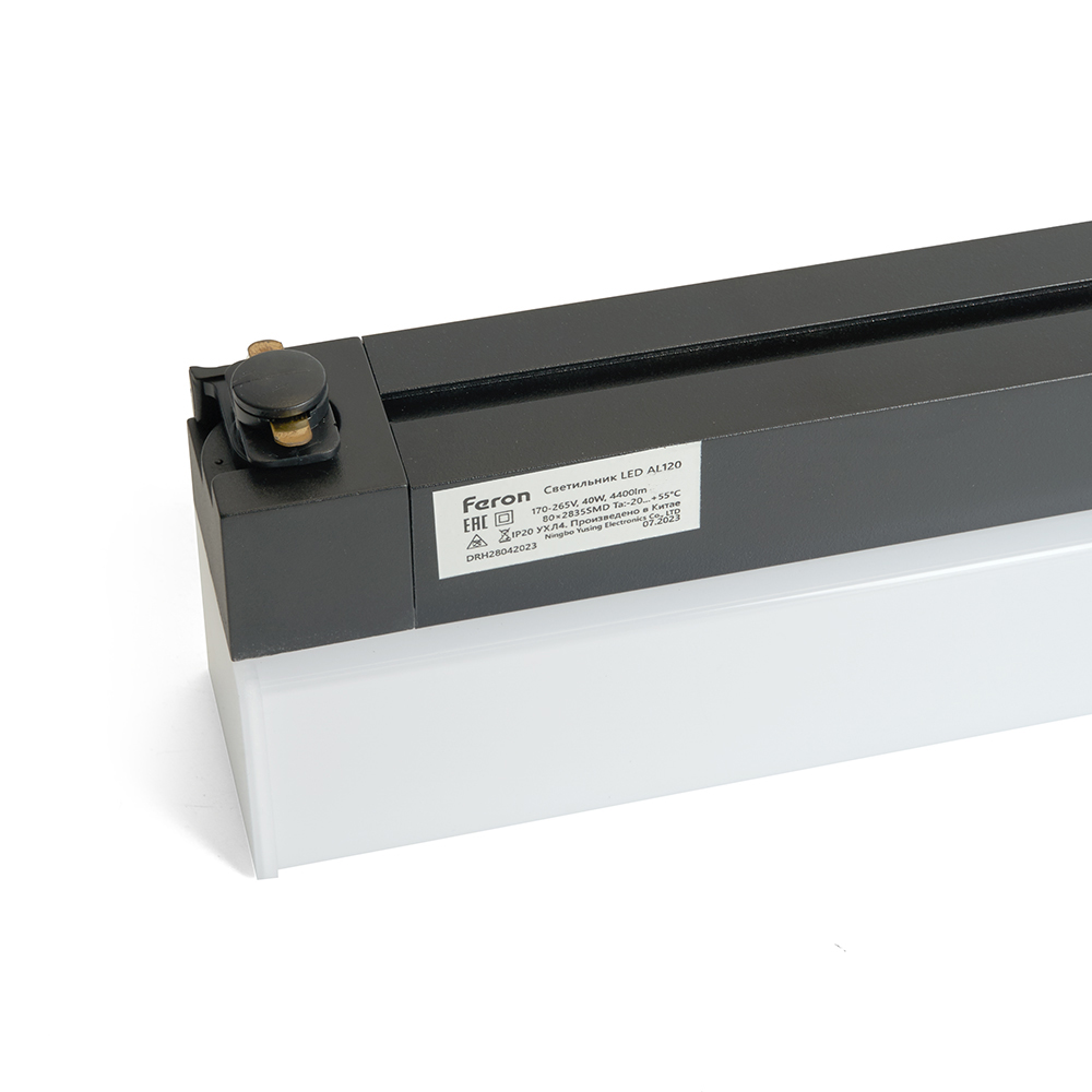 Светильник трековый на шинопровод, однофазный (ДПО) FERON AL120, 60W, 6500К (дневной), 170-265V, 6600Lm, цвет черный, корпус алюминий, пластик, рассеиватель пластик, вращение →0°/↓0°, 1200*47*77 мм
